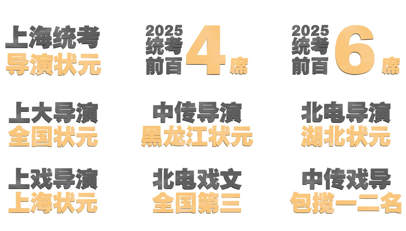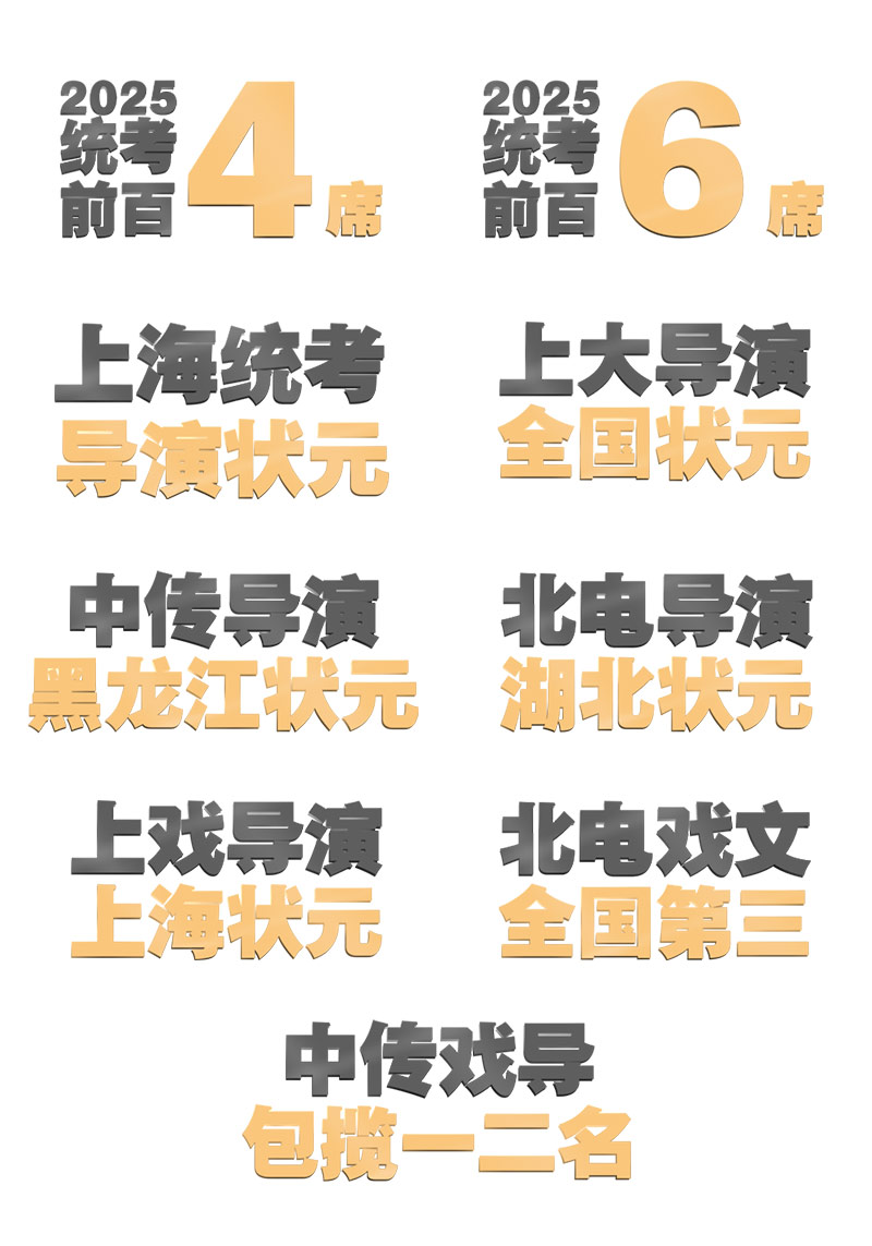 • 2023年拿到上海戲劇學院戲劇影視導演全國第六(上海第一),上海大學戲劇影視導演全國第一,北京電影學院戲劇影視文學全國第三