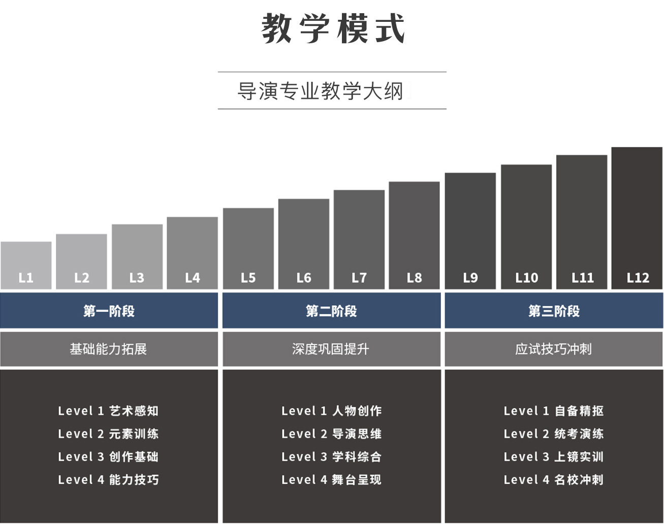 導演課程圍繞上海市統考內容展開,包括但不僅限于統考內容,除表演、朗誦、敘事寫作三類固定要求外,還設置一系列導演模塊訓練與導演思維訓練。經典分段班周期共12周,由淺入深分為三個進階躍升階段,涵蓋文學藝術素養積累、戲劇舞臺活動實踐、戲劇類與電影類腳本創作、導演應試模塊訓練、以及考前面試賦能等等,除集體課外,還設置導師組小課一對一精摳,旨在培導演生三種能力,不僅能駕馭舞臺,也能駕馭寫作,同時還能運用鏡頭語言進行創作。