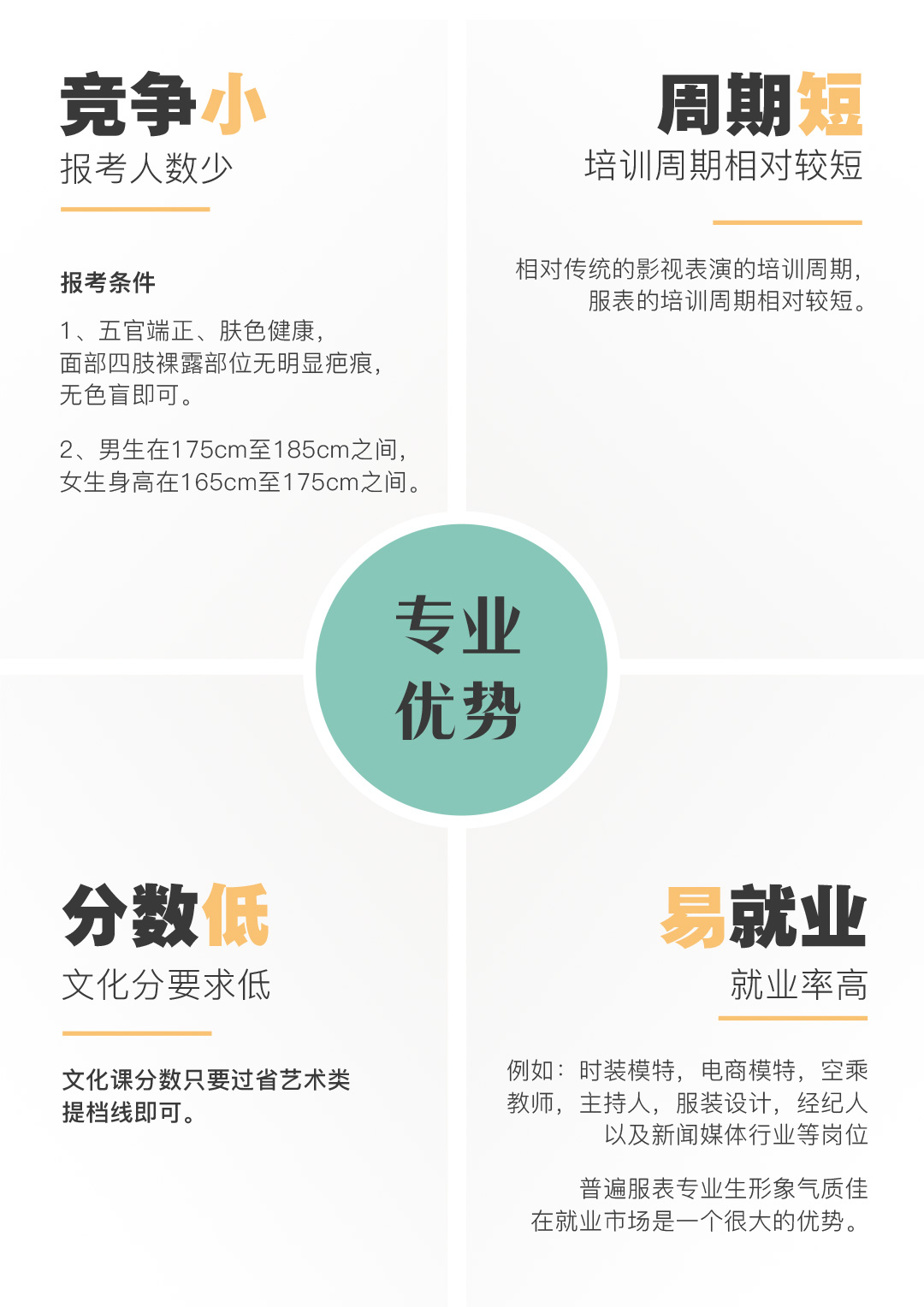 時裝表演(服裝表演)專業(yè)屬于新興的高校學(xué)科,作為浙江省八大藝術(shù)專業(yè)類別之一,同其他藝術(shù)類專業(yè)一樣需要統(tǒng)一參加專業(yè)考試和高考文化課考試。隨著服裝行業(yè)的迅速發(fā)展,服裝的展示環(huán)節(jié)中對文化內(nèi)涵的不斷提高,模特行業(yè)也被賦予了新的評判標(biāo)準(zhǔn)。“模特”再也不能只是展示服裝的“道具”,而應(yīng)該是有學(xué)歷、有文化、有修養(yǎng)的一批專業(yè)技能型人才。